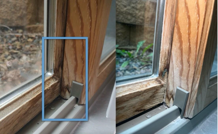 Below is a photo of a window (left) pointed out in an inspection report. On the right is the same window four months later, showing ongoing moisture damage and organic growth.
